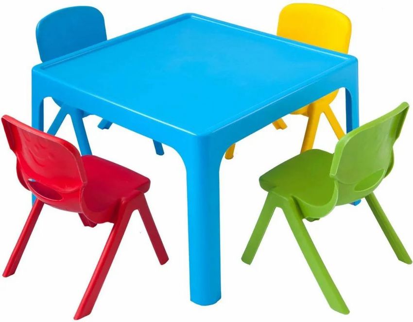 Yellow plastic FRP square table for children aged 2-10. Durable, weather-resistant, suitable for indoor/outdoor preschool use. Dimensions: 24"x24"x20".
