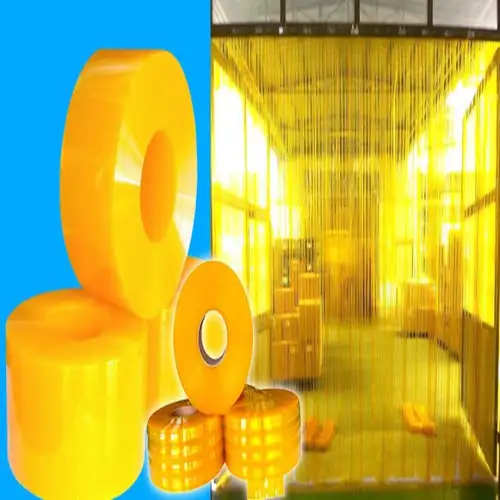 Yellow PVC strip curtains, 8-inch size, 50-meter length. Plain pattern, designed for vertical door application. Suitable for industrial use.