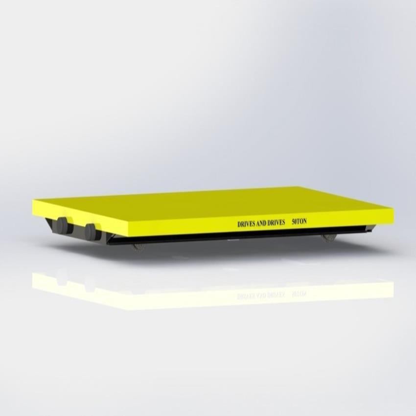 Yellow mild steel rail mounted industrial transfer trolley with 70 Ton capacity, obstacle avoidance, and four wheels. Measures 8000mm length.