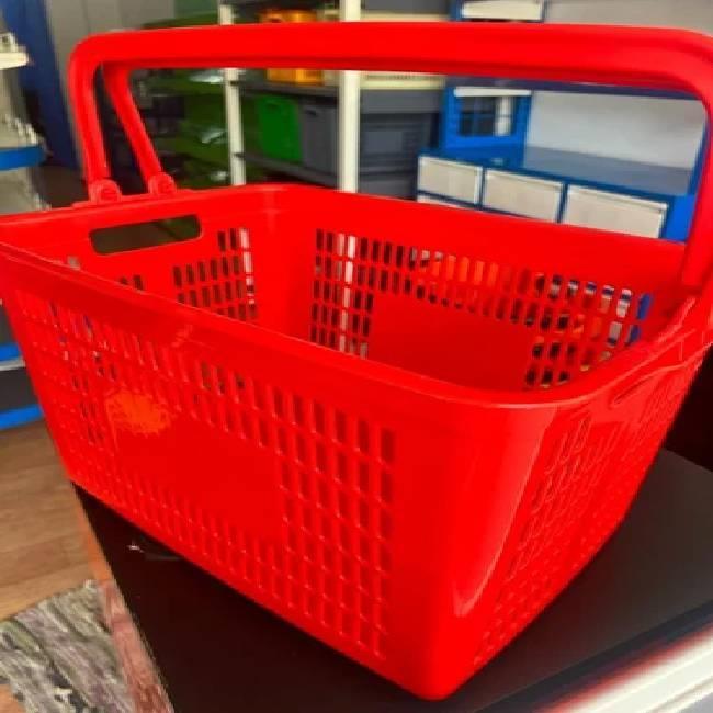 This plain yellow and red plastic handle basket offers a 20kg loading capacity for shopping. Size: 25x20x6 inches (LxHxW).
