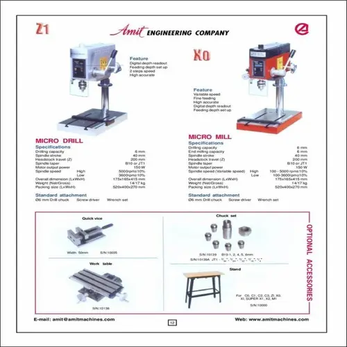 The Z1 micro drill machine features a 150 Watt electric motor, capable of drilling up to 6 mm diameter. Weighs 14-17 Kg, suitable for precise tasks.