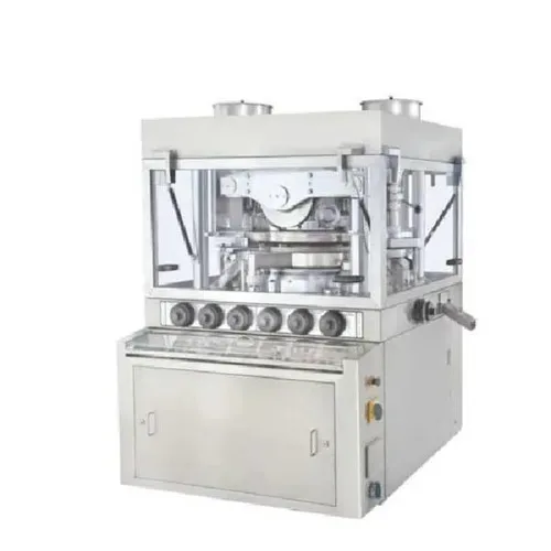 Rotary tablet press machine, SS316L stainless steel construction for industrial use. Features coated surface finishing and achieves a maximum output of 540,000 tablets per hour for 75 stations.